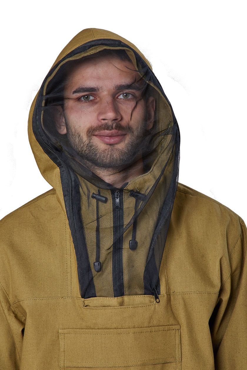 ➠ Куртка прямого силуэта с отрезными кокетками полочки, с капюшоном сложной конструкции, исключающей проникновение насекомых под одежду. Капюшон с противомоскитной сеткой. Низ куртки стягивается эластичным шнуром с фиксатором. Рукава втачные, с трикотажными манжетами-напульсниками. Полочка с накладным карманом с клапаном. В шве притачивания капюшона к полочке выполнен внутренний карман для противомоскитной сетки.