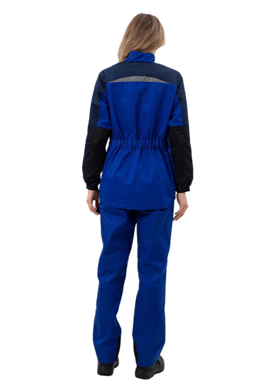 ➠ Брюки с застежкой на молнию, с притачным поясом, стянутым резинкой в области боковых швов для лучшей посадки на фигуре, пояс со шлёвками. Застежка пояса на пуговицу. Брюки с боковыми карманами с наклонной линией входа, с наколенниками и усилениями по шаговому шву. На задней половинке брюк фигурный накладной карман. На боковом шве брюк расположен накладной многофункциональный карман с фигурным клапаном и застежкой на липучку. Костюм со светоотражающими фигурными полосами для лучшей видимости в темное время суток.