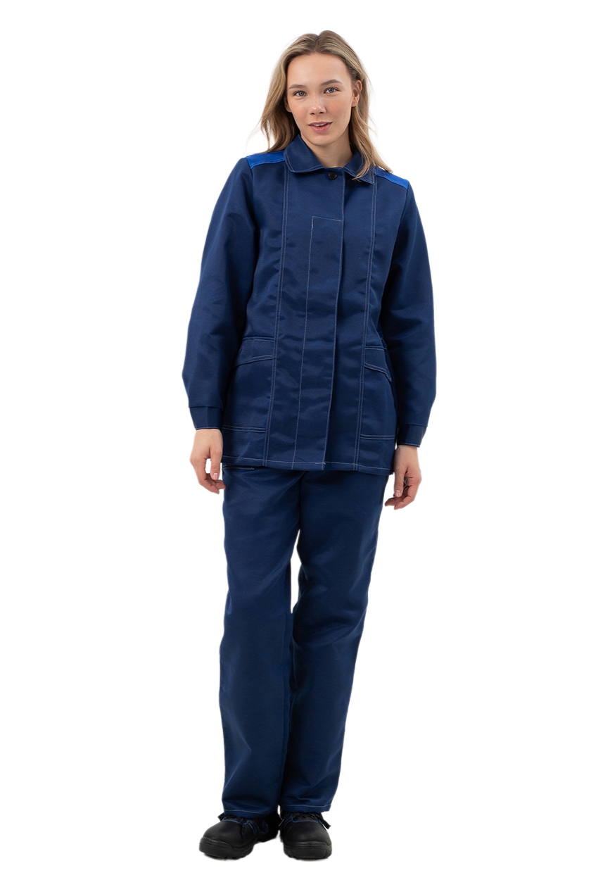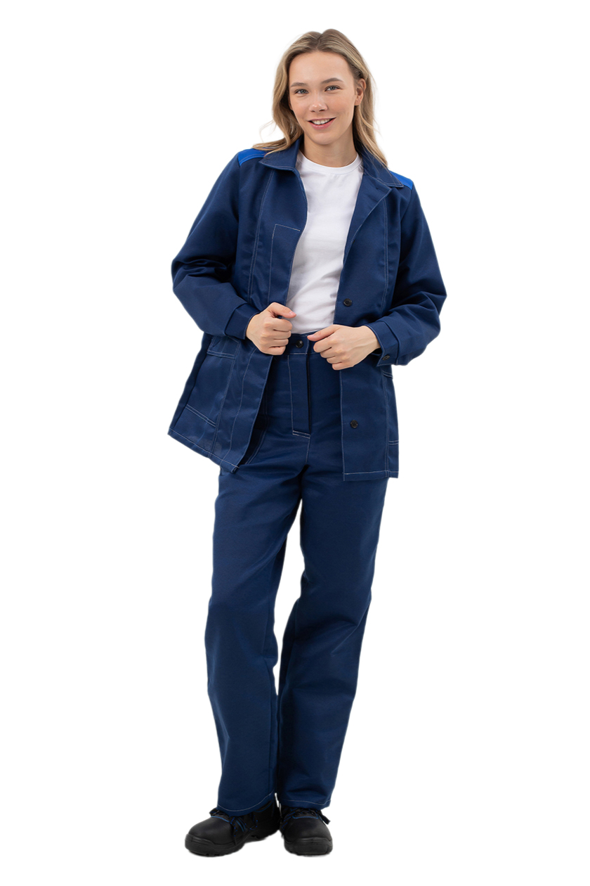 ➠ Куртка прямая, с центральной бортовой супатной застежкой на петли и пуговицы. Воротник отложной. Полочки с рельефами. Два нижних накладных кармана с фигурными клапанами. Левый нагрудный карман с отделением для ручки. Рукава с манжетами, застегивающимися на пуговицу. В области талии кулиса со шнуром и фиксатором.