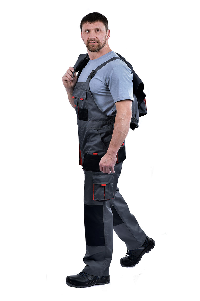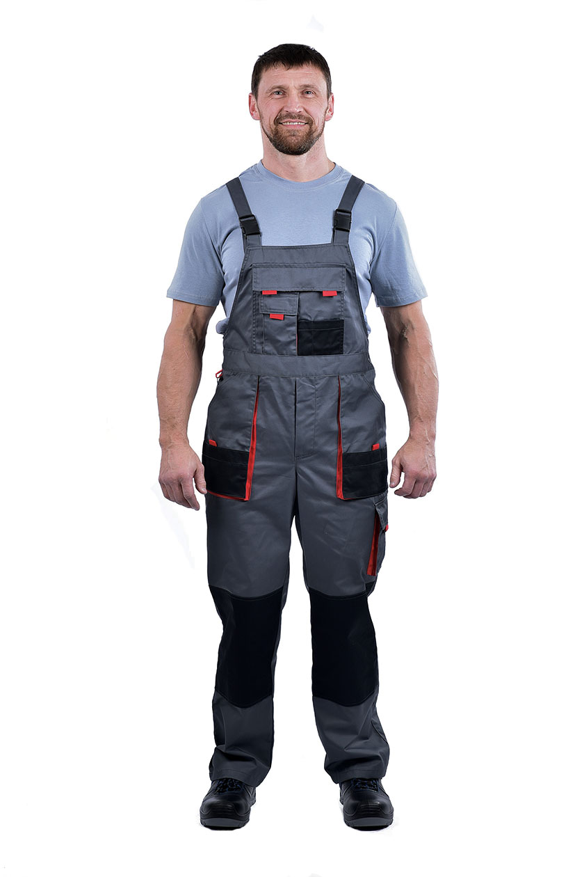 Застежки по бокам на пуговицы. Многочисленные объемные карманы. Усилительные накладки в области коленей.
