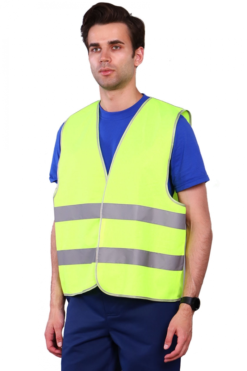 Жилет прямого силуэта, центральная застежка на липучку. Две полосы СОП 50 мм расположены на передних полочках и спинке в два ряда.